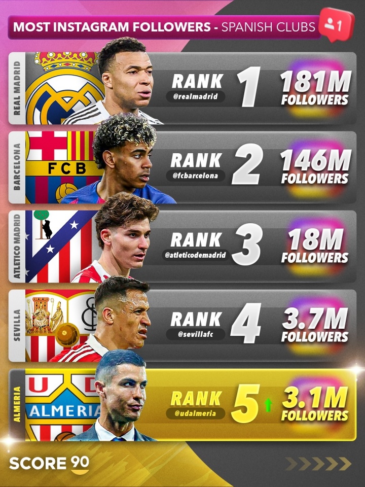 PG电子官网-C罗收购阿尔梅里亚后,球队社媒粉丝数飙升,成西班牙球队第五多