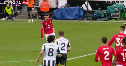 第45+9分钟,B费定位球助攻,卡塞米罗抢点头槌破门,曼联1-1!